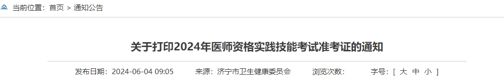 山东济宁市2024年医师资格实践技能考试准考证打印的通知