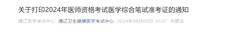 内蒙古通辽2024年医师资格医学综合笔试准考证打印通知