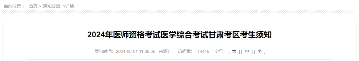甘肃省医师资格考试领导小组办公室发布关于2024年医师资格考试医学综合考试甘肃考区考生须知,考生于8月10日起登陆国家医学考试中心官网,进入“考生服务系统”下载打印准考证,通知详情如下: