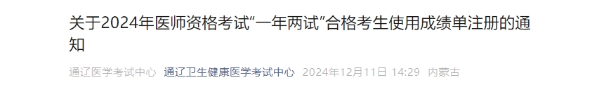 内蒙古通辽市2024年医师资格考试“一年两试”合格考生使用成绩单注册的通知