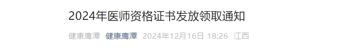 江西鹰潭考点2024年医师资格证书发放领取通知