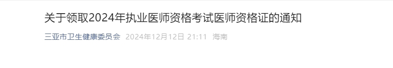 海南省三亚市卫生健康委员会发布关于领取2024年执业医师资格考试医师资格证的通知,通知详情如下: