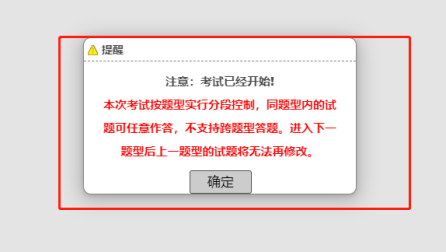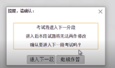 3、考试过程中,在当前题型还存在未完成作答的题目时,考生操作试题分段切换时,系统会提醒: