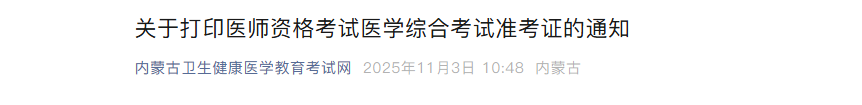 内蒙古自治区2025年医师资格医学综合考试准考证的通知