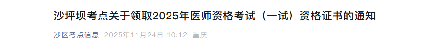重庆沙坪坝考点2025年医师资格考试(一试)资格证书领取通知