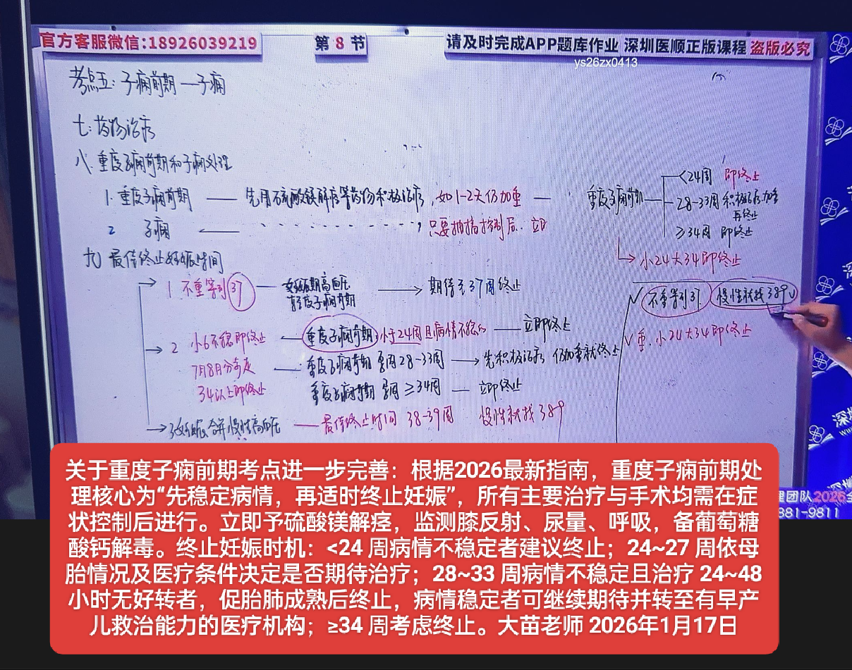 正确为:关于重度子病前期考点进一步完善:根据2026最新指南,重度子病前期处理核心为“先稳定病情,再适时终止妊娠”,所有主要治疗与手术均需在症状控制后进行。立即予硫酸镁解痉,监测膝反射、尿量、呼吸,备葡萄糖酸钙解毒。终止妊娠时机:<24周病情不稳定者建议终止;24~27 周依母胎情况及医疗条件决定是否期待治疗;28~33 周病情不稳定目治疗24~48 小时无好转者,促胎肺成熟后终止,病情稳定者可继续期待并转至有早产儿救治能力的医疗机构;≥34周考虑终止。