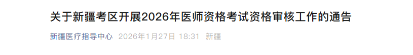 新疆自治区卫生健康委员会发布关于新疆考区开展2026年医师资格考试资格审核工作的通告,新疆考区2026年医师资格考试资格审核工作通过网上审核模式进行(现役军人和部队文职人员除外),现将有关事项通告如下: