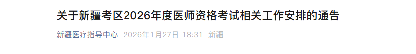 新疆自治区卫生健康委员会发布关于新疆考区2026年度医师资格考试相关工作安排的通告,网上报名时间为1月29日至2月11日,资格审核时间为2026年2月27日至2026年3月12日,新疆考区继续实行网上资格审核,具体安排另行通知。通知详情如下: