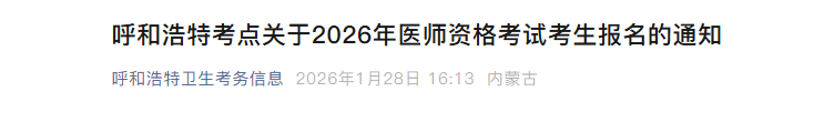 内蒙古呼和浩特考点关于2026年医师资格考试考生报名的通知,网上报名时间自2026年1月29日10时至2026年2月11日24时,逾期不予补报。通知详情如下: