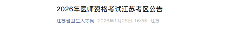 江苏省医学考试中心发布关于2026年医师资格考试江苏考区公告,网上报名时间:1月29日10时至年2月11日24时,考点线下现场审核时间为2月27日至3月12日。通知详情如下: