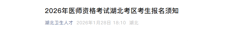 湖北省卫生健康委员会发布关于2026年医师资格考试湖北考区考生报名须知,网上报名时间:1月29日10时至年2月11日24时,资格审核为2月27日至3月12日。通知详情如下: