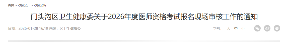 北京市门头沟区卫生健康委关于2026年度医师资格考试报名现场审核工作的通知,报名时间为于1月29日10时至2月11日24时,现场确认时间:2026年3月4日-3月5日。通知详情如下: