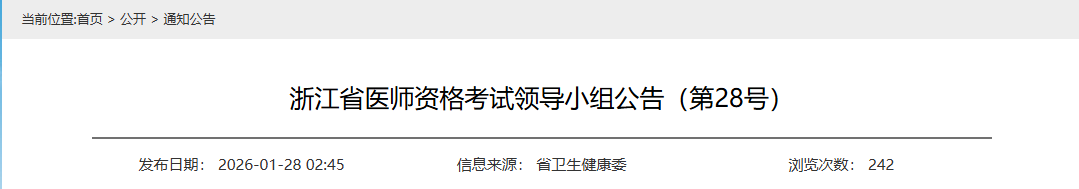 浙江省医师资格考试领导小组发布关于浙江考区2026年医师资格考试工作有关事项公告,网上报名时间自1月29日10时至2月11日24时,现场审核为2月27日至3月12日期间,通知详情如下: