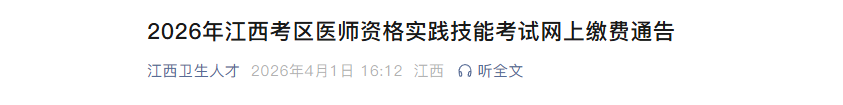 江西卫生健康委员会发布关于2026年江西考区医师资格实践技能考试网上缴费通告,考生通过报名资格审核后,在规定时间内(2026年4月2日-4月13日)缴纳实践技能考试费。通知详情如下: