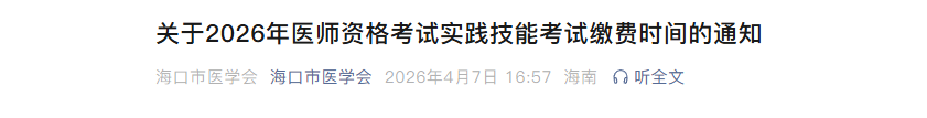 海南省海口市医学会发布关于2026年医师资格考试实践技能考试缴费时间的通知,医学综合考试实践技能缴费时间:2026年4月1日-4月8日24时,通知详情如下: