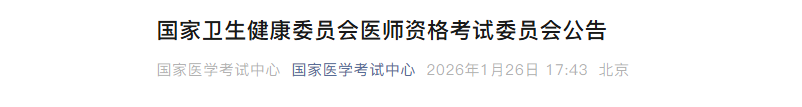 根据《中华人民共和国医师法》和《医师资格考试暂行办法》规定,2026年将在全国举行医师资格考试。临床、口腔、公共卫生类别和乡村全科执业助理医师医学人文部分启用修订后的考试大纲。现就有关事项公告如下: