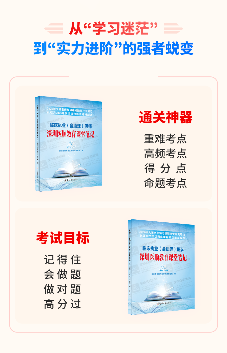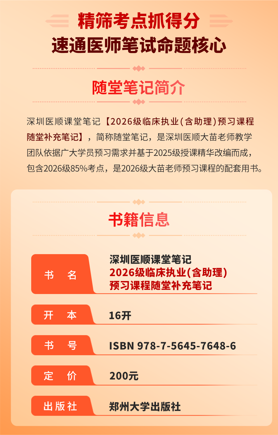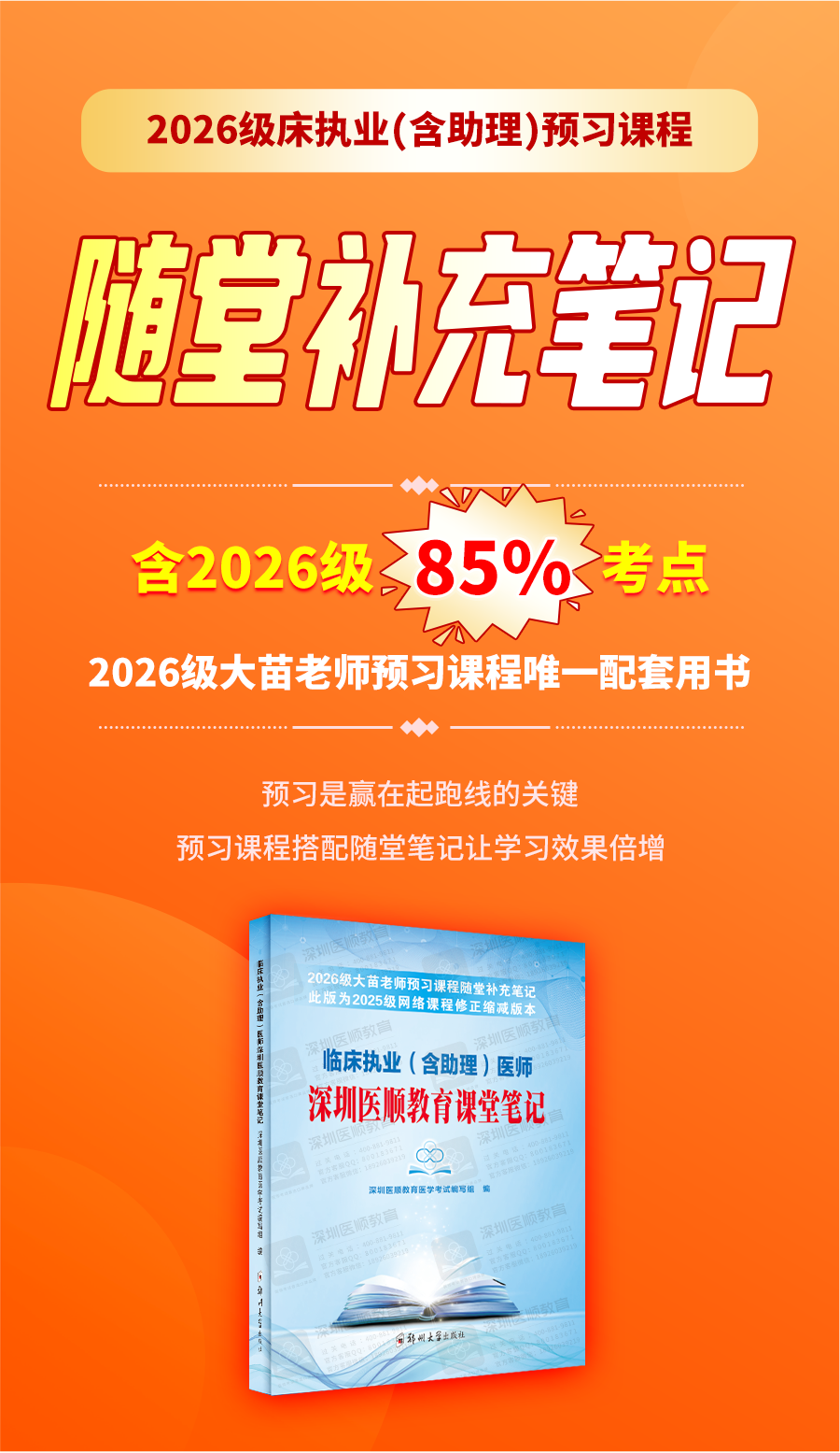 深圳医顺教育《2026级临床执业(含助理)预习课程随堂补充笔记》(简称随堂笔记)是深圳医顺大苗老师教学团队依据广大学员预习需求并基于2025级授课精华改编而成,包含2026级百分之八十五考点,是2026级大苗老师预习课程的唯一配套用书。